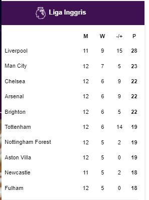 Chelsea, Arsenal, dan Brighton terus membuntuti dengan sama-sama mengoleksi 22 poin. Tottenham yang tampil gemilang kini mengintip posisi lima besar dengan 19 poin.